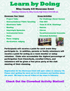 4-H Showcase event will be February 23, 2019 at Riley County High School. It will include what was formerly Gavel Games and Club Day. Events will begin at 8:30 am and we should be done by 3:00 pm. As part of the event we will have a STEM activity space, photography and horticulture judging, as well as a Cloverbud activities. Breakfast and lunch items will be served throughout the day. Registration will open to 4-Hers the week of January 7.